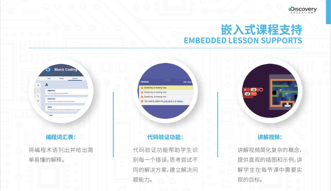 Discovery Education Coding是探索教育推出的一款支持自学编程的数字化工具,通过step-by-step的课程设计引导学生自主学习,将原本枯燥的代码编程语言以游戏启蒙、情景动画及可视化图形的形式呈现,并通过分解任务、逻辑推理和解决问题来培养学生的计算思维能力。除此之外,学生还可以创建自己的应用程序,通过分享自己的作品与全球的Coding使用者交流编程技术。