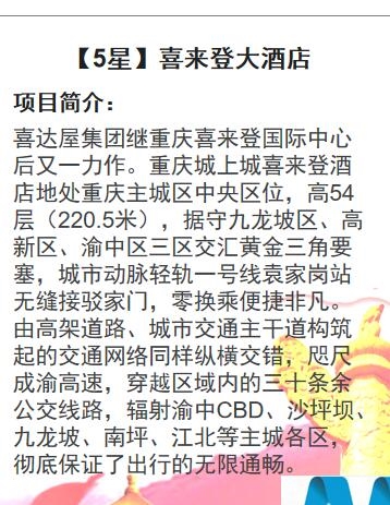 重庆好的四星级酒店之一。位于繁华的商业金融中心—解放碑。酒店为32楼高层建筑,拥有228套各式温馨客房。7楼为酒店大堂和艾伦多西餐厅、9楼为酒店商务会议中心、27-31楼为锦芳宴中餐厅。 酒店每间客房都经过精心设计布置,高速观光电梯、高速网络、境外电视、智能接触式门锁、楼宇安全系统带给您如家般温馨私密。 艾伦多自助餐厅任您享用各国美食。锦芳宴中餐厅集谭家菜、粤菜、川菜三大菜系为一体,引领美食前沿。