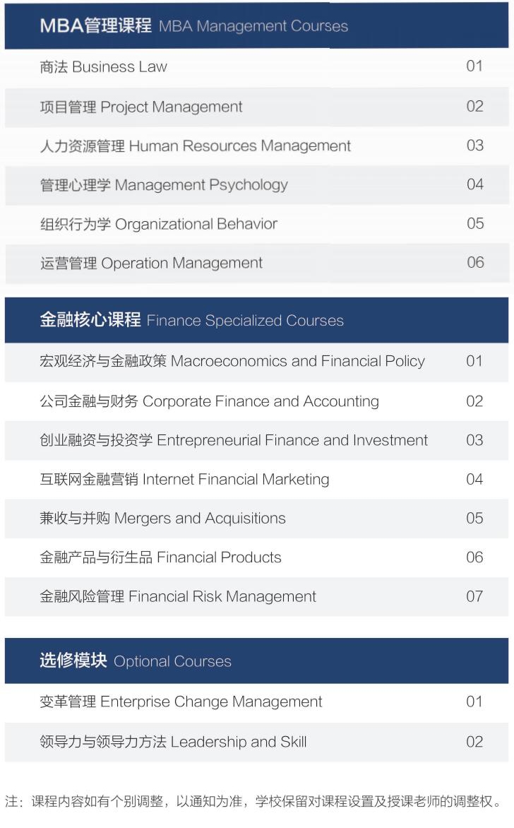 该项目囊括了MBA的课程体系中常规的管理课程,同时专注于金融行业。课程设计既着眼飞速发展的全球金融市场,又紧密贴近变革和发展中的中国资本市场实践。