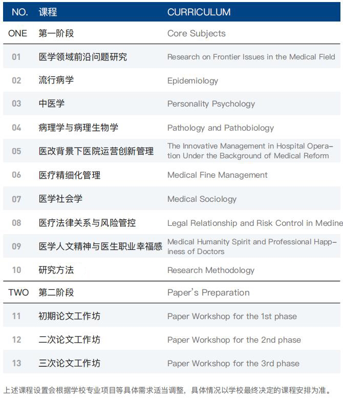 本课程分为通用课程和专业课程模块,共 10 门课,顺利完成所有课程修读以及论文即可获颁 “医学博士” 学位证书。