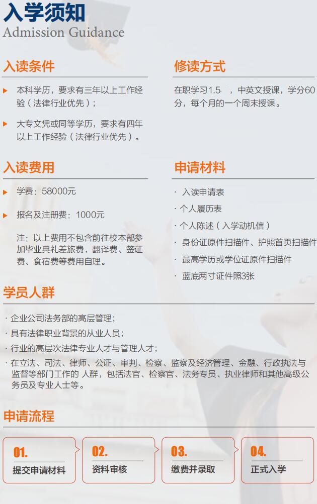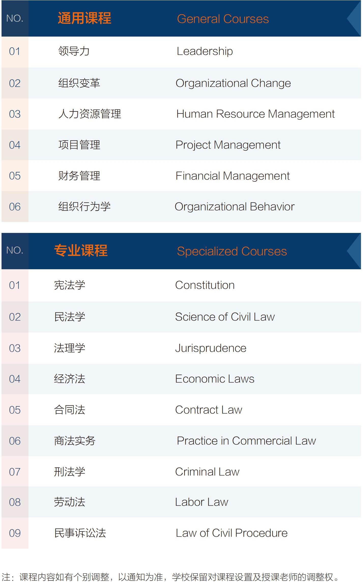 本课程分为通用课程和专业课程模块,共15门课,顺利完成所有课程修读以及论文即可获颁“法律硕士”学位证书。