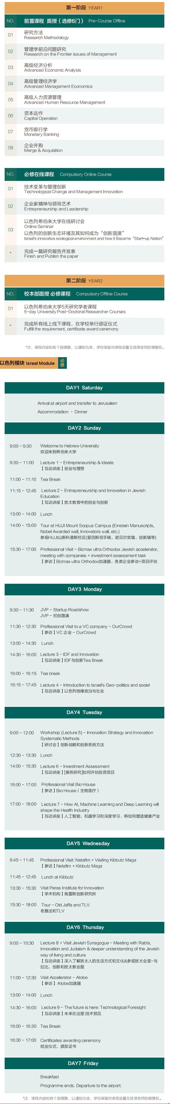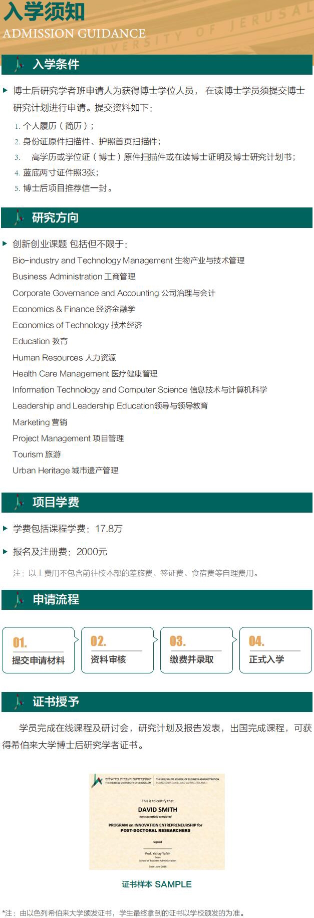 以色列希伯来大学创新创业博士后研究者班项目招收中国以及亚洲地区高级管理人员参加博士后研究课程,项目针对系统接受过博士专业教育的人士而开办,为研究与实践相结合的高端教育项目;具备研究和创新能力是高级管理人员必备的素质,参加博士后研究班项目将取得研究经验来提升个人的综合能力。